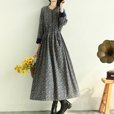 复古文艺加长款碎花加绒连衣裙冬季蕾丝棉麻加厚长裙子宽松森女系