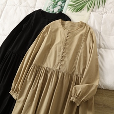 2025秋季新款复古棉麻长袖连衣裙女简约气质宽松慵懒风过膝中长裙