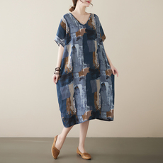 大码女装 胖MM棉麻复古文艺撞色连衣裙中长款微胖百搭裙子显瘦