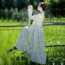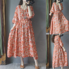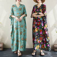 折扣夏季花色度假风旅游V领复古长裙遮肉棉麻连衣裙子加长款裙子