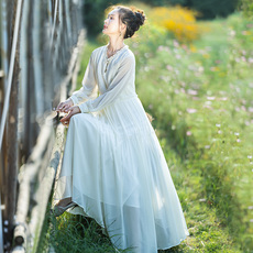 秋季文艺复古刺绣蕾丝花边圆领长袖连衣裙宽松棉麻简约中长连衣裙