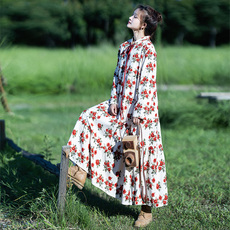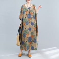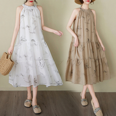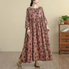 高端印花文艺棉麻 宽松木耳领减龄显瘦亚麻连衣裙女 中长款过膝裙