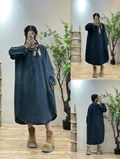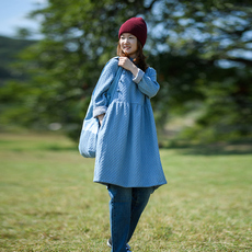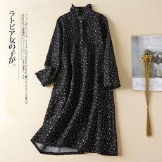 念旧原创/1111B 文艺纯亚麻加绒宽松袍子女纯色厚连衣裙