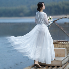 晨语 高品质苎麻连衣裙大码宽松休闲长裙夏浪漫法式度假风大裙摆