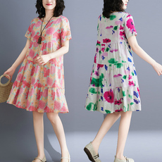 外贸出口折扣捡漏胖妹妹夏季宽松显瘦短袖棉麻连衣裙子中长款过膝