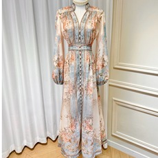 区别市场版1OO%真丝 复古中古风深V收腰桑蚕丝印花连衣裙度假长裙