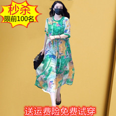 2025夏季新款高级感圆领大版200斤妈妈真丝连衣裙宽松大码长裙子