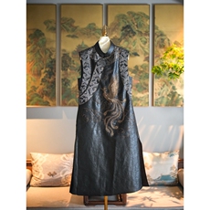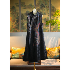 蓝大原创女装重工凤凰刺绣立领无袖桑蚕丝宋锦黑色长款连衣裙5518