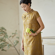 布符2025年秋季真丝冠乐绉斜裁连衣裙立体提花旗袍风珠扣喇叭袖
