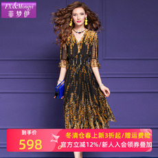 水墨佳人2025新款女装夏优雅中长款刺绣气V领长裙真丝遮肉连衣裙