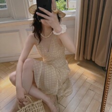 奥芝国无袖真丝质感钉珠挂脖连衣裙女早春旅游纱裙纱裙垂坠感裙子