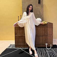 2025夏季长袖超仙旅游度假拍照真丝桑蚕丝连衣裙收腰显瘦大摆长裙
