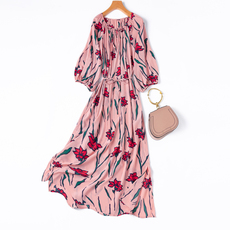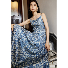 【假日晨曦】重工打揽 度假风一字领吊带收腰显瘦真丝印花连衣裙