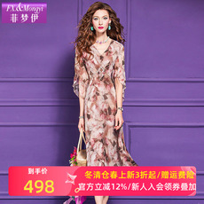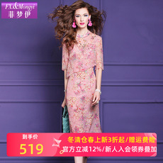 菲梦伊100桑蚕丝原创印花连衣裙女夏装高端真丝钉珠改良旗袍裙子