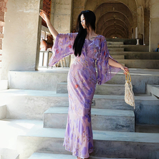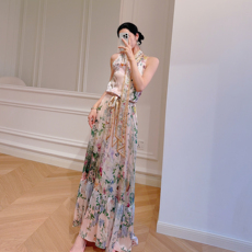 新款名媛气质女神范印花真丝桑蚕丝连衣裙沙滩度假修身大摆长裙子