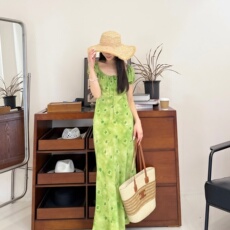 2025秋季新品真丝印花连衣裙女斜裁显瘦收腰泡泡短袖中长裙绿色