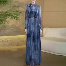 秋装新款高端时尚长袖真丝桑蚕丝连衣裙蓝色水墨印花修身显瘦长裙