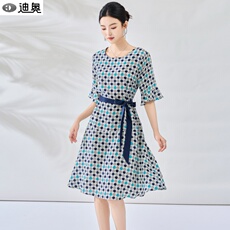 新款真丝弹力双乔印花圆领短袖系带桑蚕丝连衣裙4-1-10