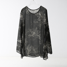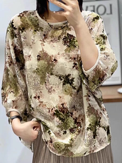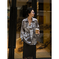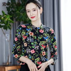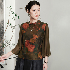 2024春秋新款 气质印花针织真丝上衣 7分袖桑蚕丝衬衫 国风女装