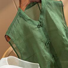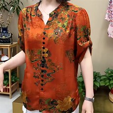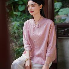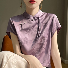 中式国风盘扣提花衬衫缎面禅意旗袍上衣立领套头衬衣真丝短袖T恤