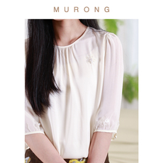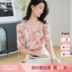 琸娅100%桑蚕丝红云纱新中式圆领系带玉扣灯笼袖花卉花萝衬衫