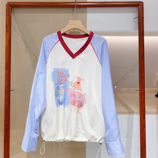 欧洲站2026春季新款V领小猫印花拼接式蝙蝠袖真丝棉长袖衬衫T恤