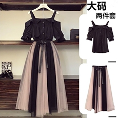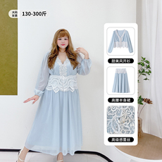300斤拼接蕾丝性感v领衬衫高腰半身裙胖莹莹大码女装春季甜美套装