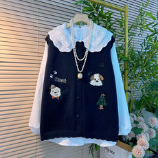大码女装2025秋胖mm韩版宽松娃娃领衬衫+针织马甲+牛仔阔腿裤套装