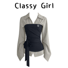 【层次感衬衫马甲假两件】蓝若水大码2026春新款减龄叠穿条纹上衣