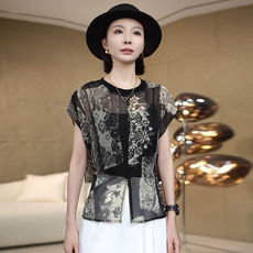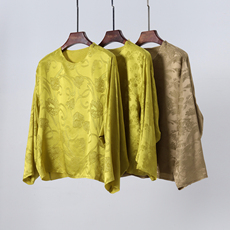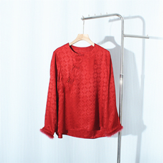 25新款夏季新中式中国风真丝提花衬衫女圆领中袖醋酸缎面宽松上衣