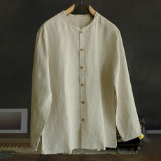 春夏新款男士休闲亚麻长袖衬衫青年潮流文艺复古纯色水洗薄衬衣
