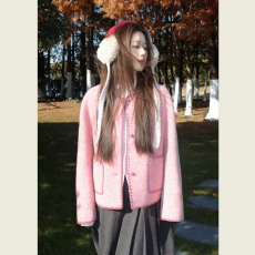 粉色圆领拼色毛呢短款外套女秋冬新款宽松温柔甜美减龄呢子上衣