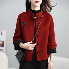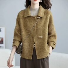 女士春秋简约毛呢外套短款加厚双面绒方领百搭开衫时尚妈妈外衣女