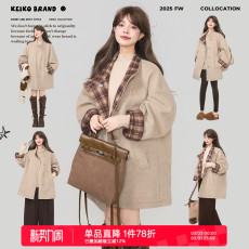 KEIKO 高级感立领羊毛呢大衣冬季韩系格纹撞色中长款呢子风衣外套