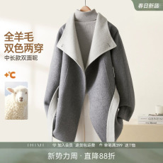 IHIMI海谧双色两穿100绵羊毛荡领毛呢大衣冬女季牛角扣中长款外套
