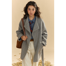 大翻领双面羊毛大衣女短款25年新款宽松翻领时尚系带明线毛呢外套