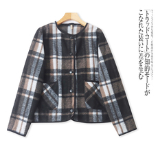 G1095外贸欧美单女士毛呢外套新款半圆领纽扣格子拼色时尚上衣