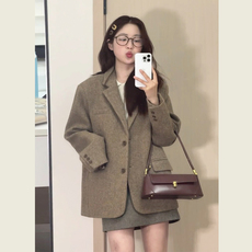 韩系复古宽松西装呢子大衣女秋冬季新款高级感小个子毛呢西装外套