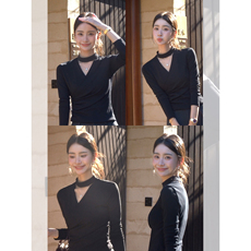 NEVA HU 黑色亨利领针织t恤女修身小V领长袖内搭打底衫气质上衣