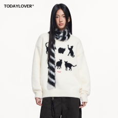 TODAYLOVER毛衣女冬季小猫提花潮牌圆领宽松慵懒风套头百搭针织衫
