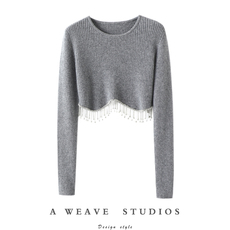 怎么都好看!手工流苏钻圆领羊绒衫女短款纯羊绒毛衣修身针织衫