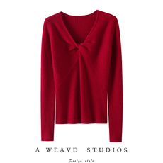 秋冬交叉V领100%纯羊毛衫女百搭长袖针织毛衣宽松羊绒衫和服上衣