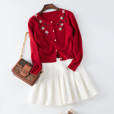 春秋冬季新款女士纯手工绣花针织山羊绒高腰短款开衫红色圆领