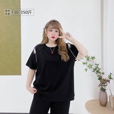 300斤特大码法式钉珠短袖T恤女夏胖mm350宽松遮肚中长款开叉上衣