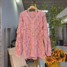 加大码女装V领飞边长袖上衣胖妹妹宽松休闲甜美减龄水貂绒蕾丝衫