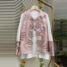加大码女装蝴蝶花朵国风棉马甲胖妹妹法式设计感毛边袖口长袖小衫
