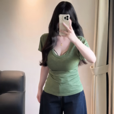 大码胖MM纯欲风U领短袖T恤女装夏季新款收腰显瘦慵懒风打底衫上衣