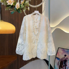蓝若水大码女装新中式盘口V领衬衫胖mm春季新款国风提花复古上衣