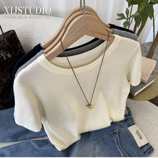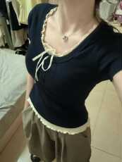 大码胖MM设计感撞色短袖T恤女夏季新款修身显瘦半开式打底衫上衣