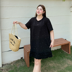 设计感重工烫钻木耳边T恤大码女装200斤夏季胖mm宽松遮胯减龄上衣
